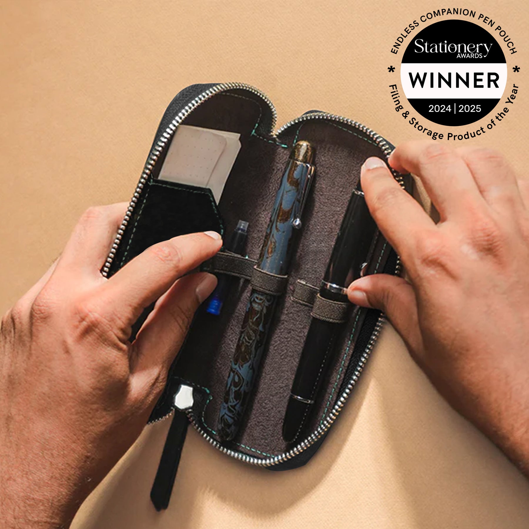 It has always been cumbersome to store pens of varying thicknesses in pen holders, until now. With our revolutionary Adjustable Elastic Band, you can store all your writing instruments snugly. In addition to the 3 Pen Slots, the Companion contains a dedicated slot for an additional refill/cartridge. The left side also includes a document flap with 3 slots for cards. Let the Companion take care of your tools, while you take care of creating!